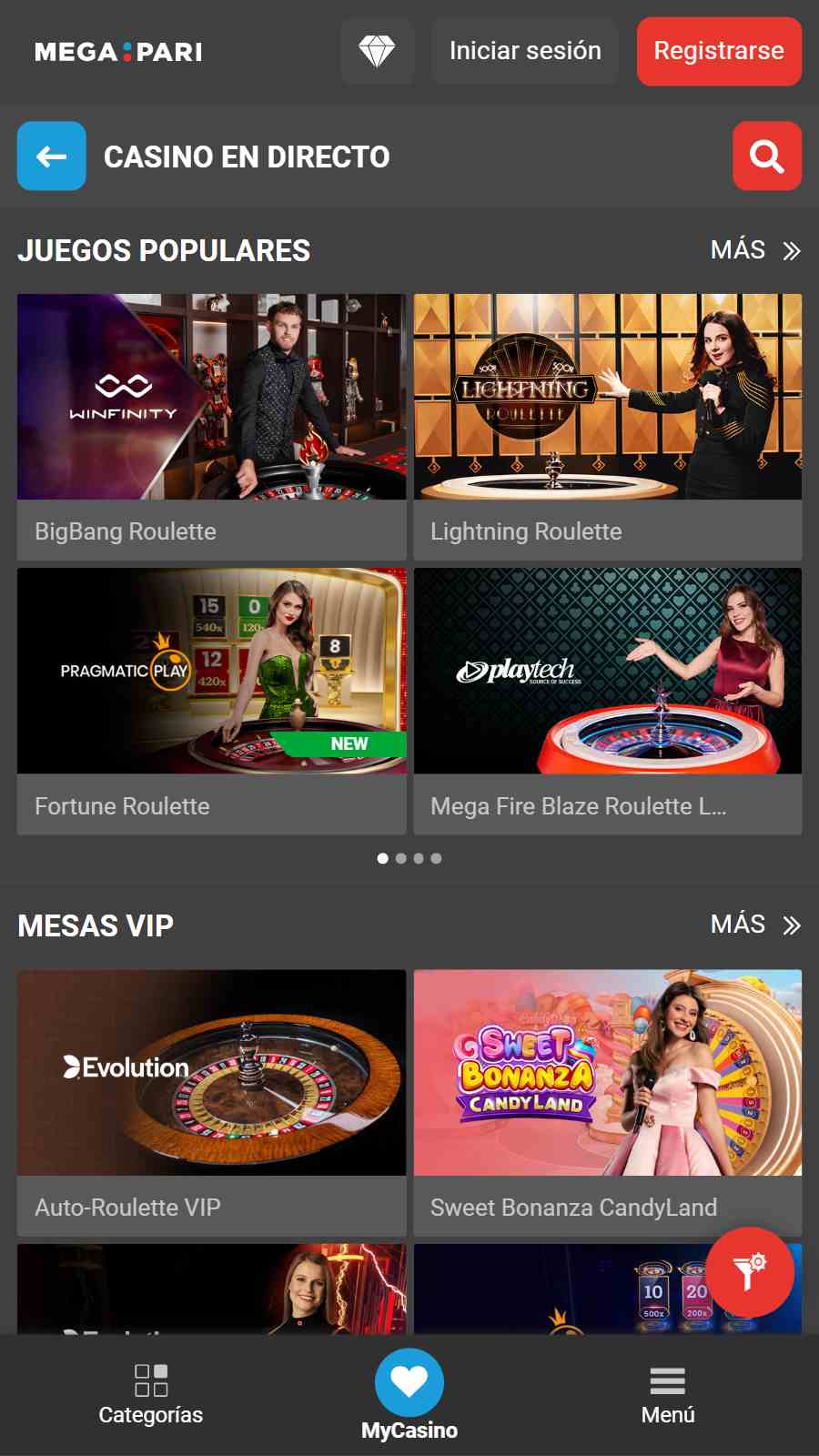 La sección de juegos en flash y mesas en directo de Megapari es una de sus grandes fortalezas. Hay pocas plataformas online que operen en Argentina con una oferta tan completa.